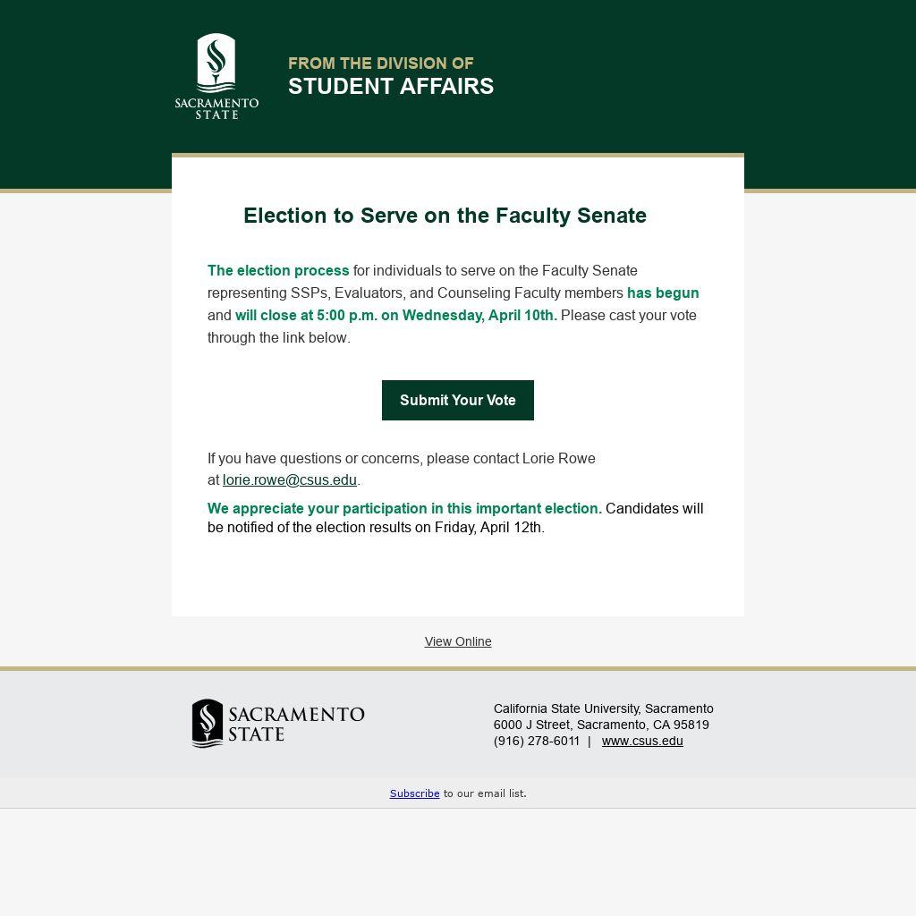 The election process for individuals to serve on the Faculty Senate representing SSPs, Evaluators, and Counseling Faculty members has begun and will close at 5:00 p.m. on Wednesday, April 10th. Please cast your vote through the link below.
