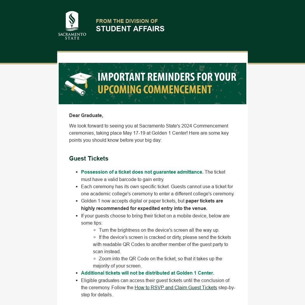 We look forward to seeing you at Sacramento State's 2024 Commencement ceremonies, taking place May 17-19 at Golden 1 Center! Here are some key points you should know before your big day: