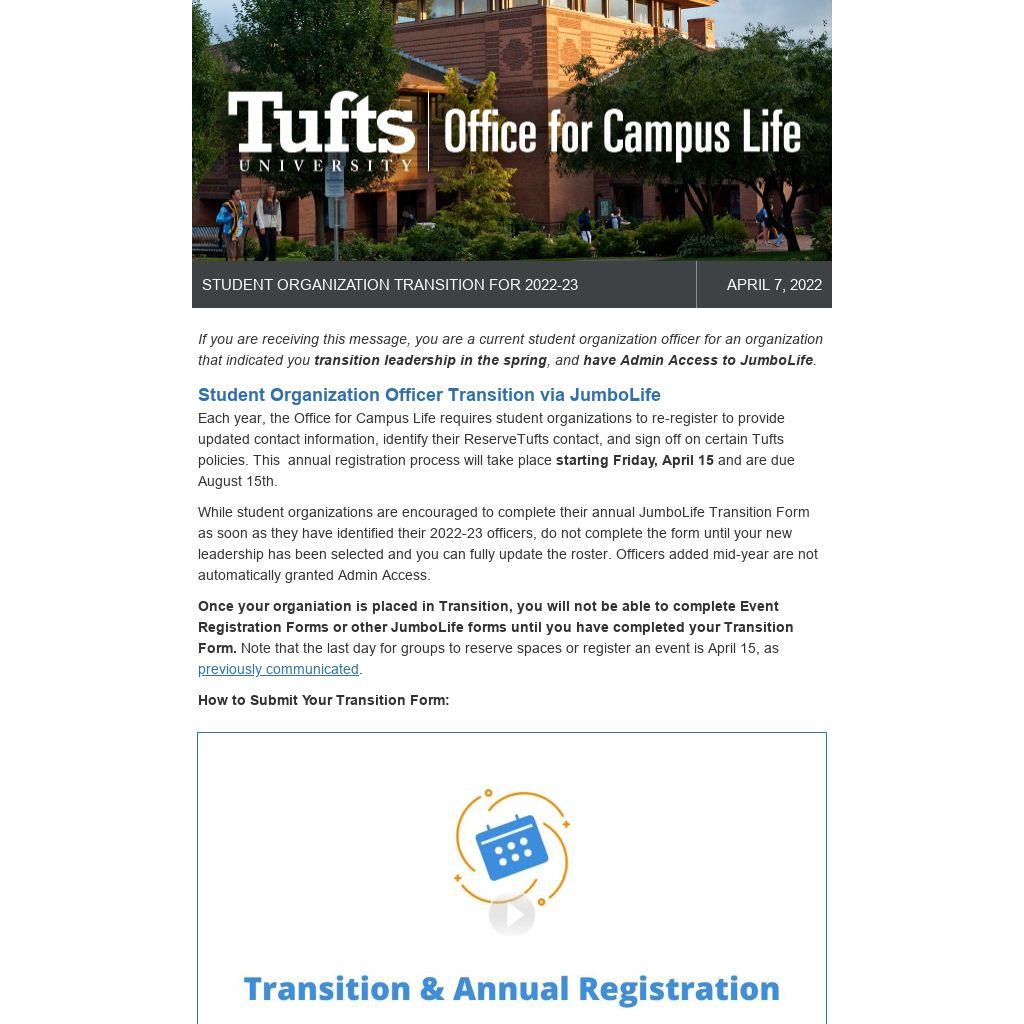 If you are receiving this message, you are a current student organization officer for an organization that indicated you transition leadership in the spring, and have Admin Access to JumboLife.