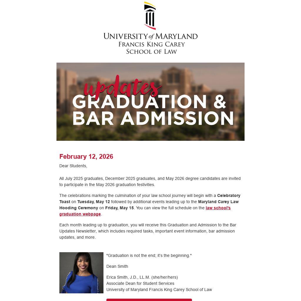 Each month leading up to graduation, you will receive this Graduation and Admission to the Bar Updates Newsletter, which includes required tasks, important event information, bar admission updates, and more.