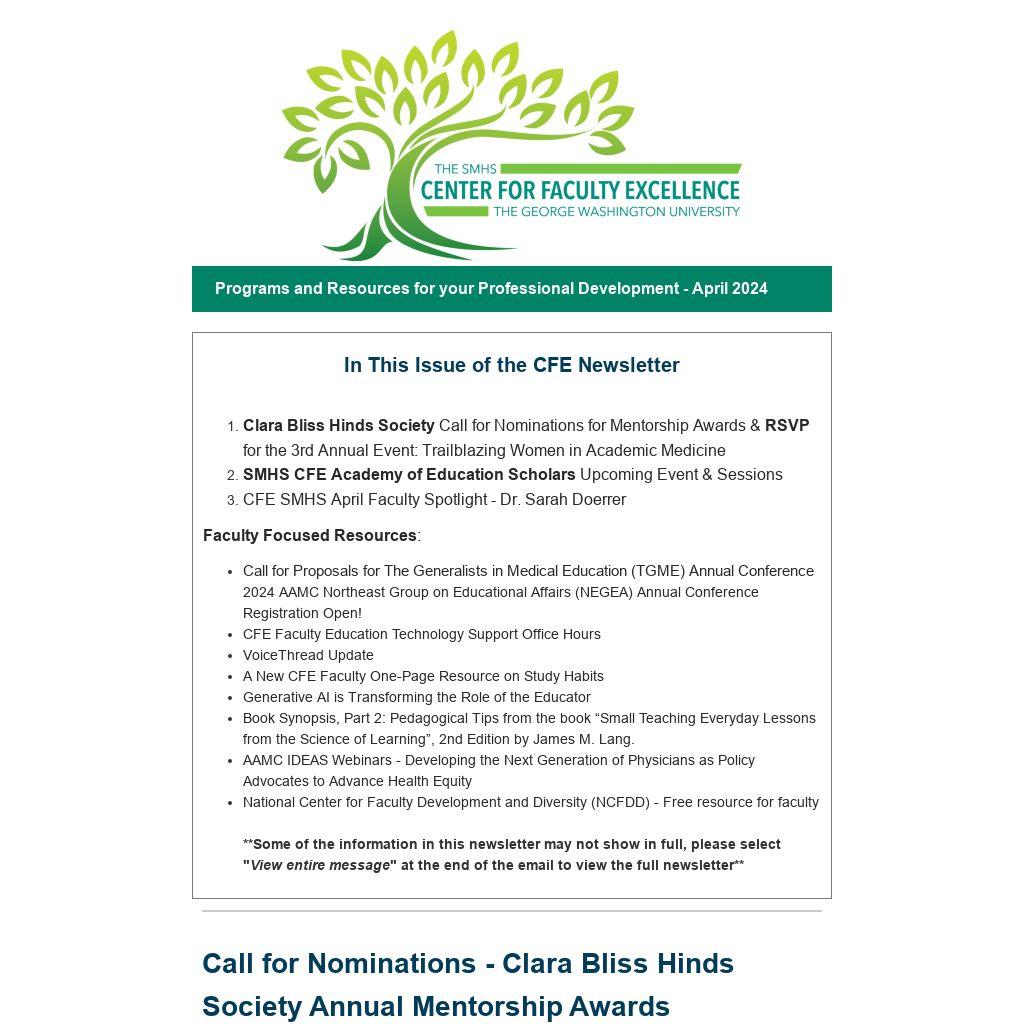 The Clara Bliss Hinds Society at the George Washington University School of Medicine and Health Sciences is pleased to announce a call for nominations for the third annual Dr. Clara Bliss Hinds Mentorship Awards. Completed nomination packages are due Monday, May 13, 2024 at 5 pm EST and should be submitted as a single pdf via email attachment to clarabliss@gwu.edu. Winners will be recognized at the 3rd Annual Clara Bliss Hinds Society Leadership Event on June 26, 2024 at 5:30 EST.