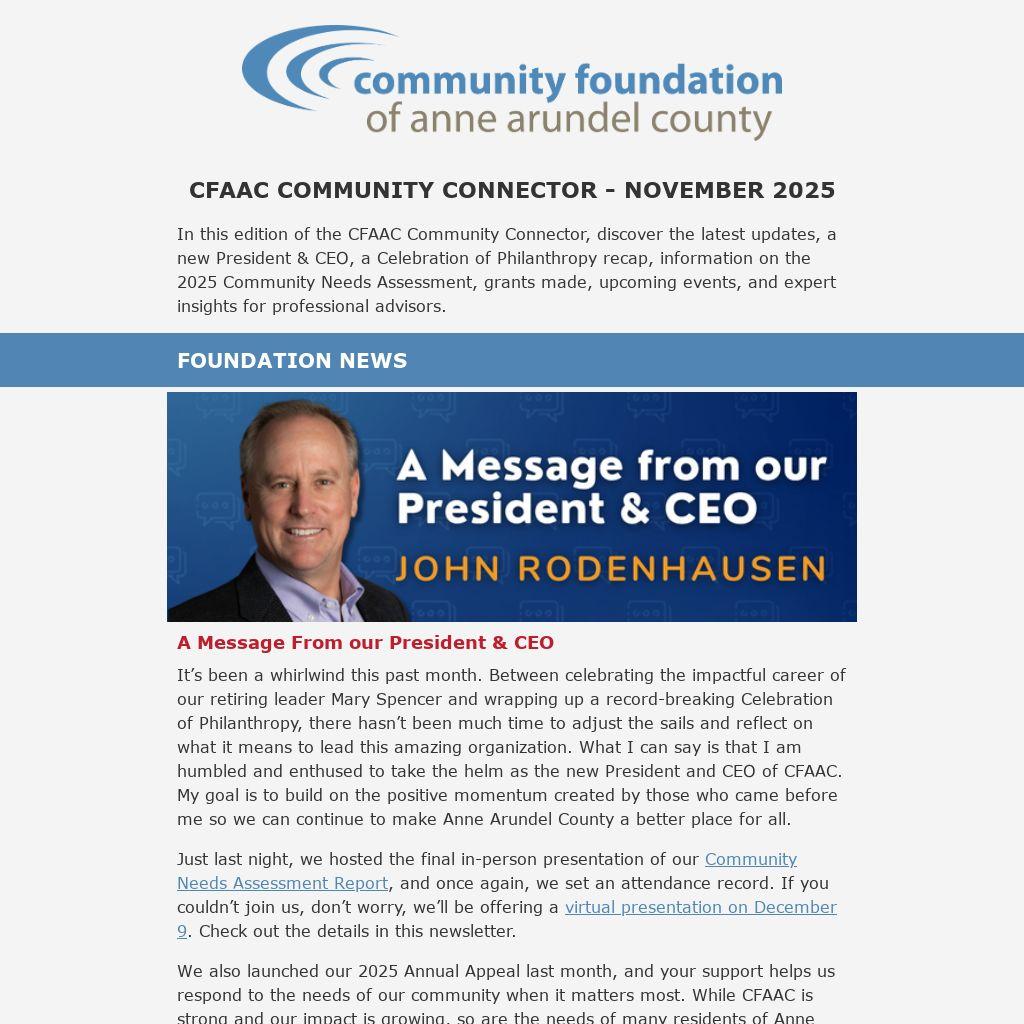 In this edition of the CFAAC Community Connector, discover the latest updates, a new President & CEO, a Celebration of Philanthropy recap, information on the 2025 Community Needs Assessment, grants made, upcoming events, and expert insights for professional advisors.