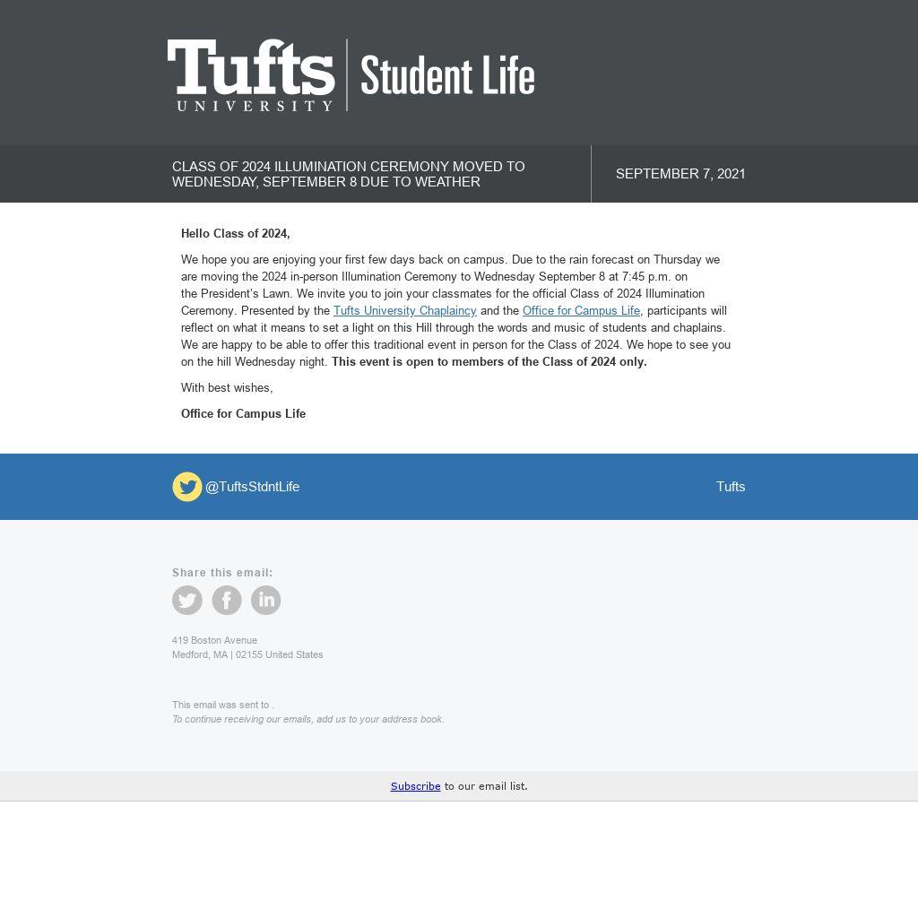 We hope you are enjoying your first few days back on campus. Due to the rain forecast on Thursday we are moving the 2024 in-person Illumination Ceremony to Wednesday September 8 at 7:45 p.m. on the President’s Lawn. We invite you to join your classmates for the official Class of 2024 Illumination Ceremony. Presented by the Tufts University Chaplaincy and the Office for Campus Life, participants will reflect on what it means to set a light on this Hill through the words and music of students and chaplains. We are happy to be able to offer this traditional event in person for the Class of 2024. We hope to see you on the hill Wednesday night. This event is open to members of the Class of 2024 only.