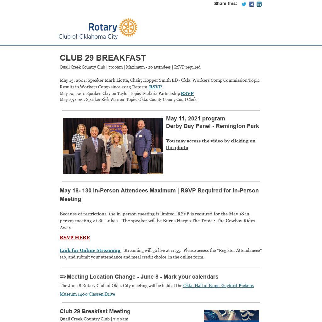 May 20, 2021: Speaker Clayton Taylor Topic: Malaria Partnership RSVP May 27, 2021: Speaker Rick Warren Topic: Okla. County County Court Clerk
