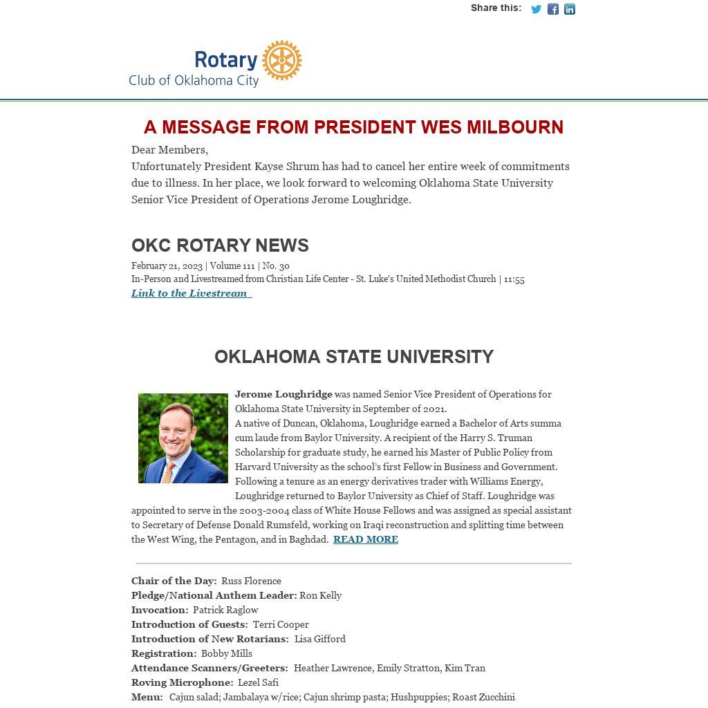 Dear Members, Unfortunately President Kayse Shrum has had to cancel her entire week of commitments due to illness. In her place, we look forward to welcoming Oklahoma State University Senior Vice President of Operations Jerome Loughridge.