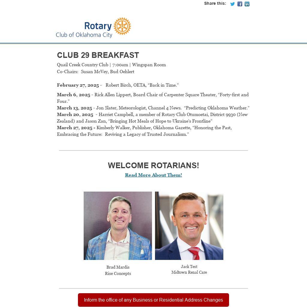 Rotary Club 29 has an online membership directory which contains current content information for all club members. The link to access the Club 29 directory can be found at the top of  the home page of  okcrotary.club or by clicking here.