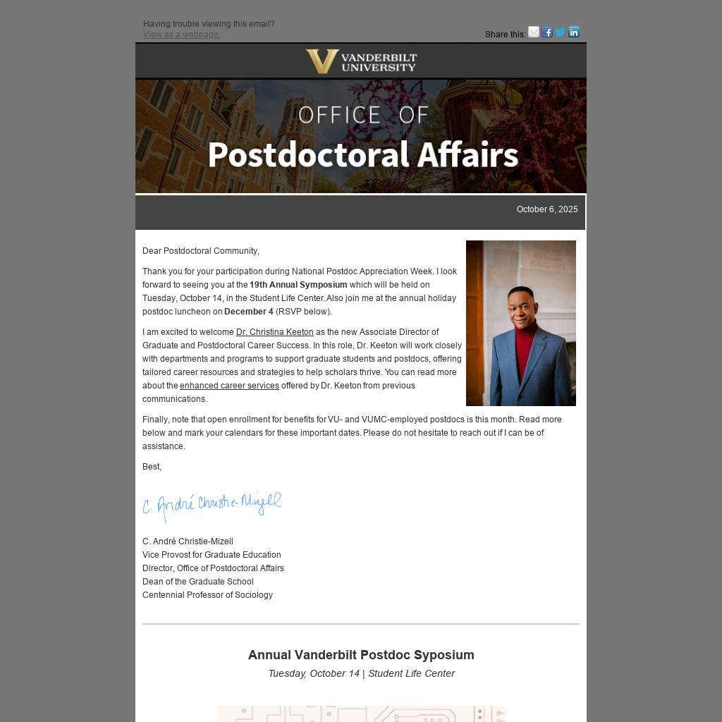 Finally, note that open enrollment for benefits for VU- and VUMC-employed postdocs is this month. Read more below and mark your calendars for these important dates. Please do not hesitate to reach out if I can be of assistance.