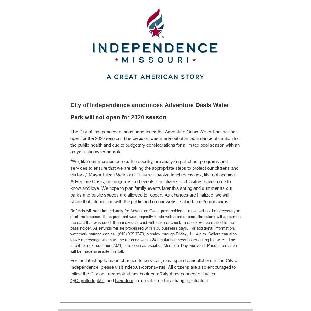 The City of Independence today announced the Adventure Oasis Water Park will not open for the 2020 season. This decision was made out of an abundance of caution for the public health and due to budgetary considerations for a limited pool season with an as yet unknown start date.