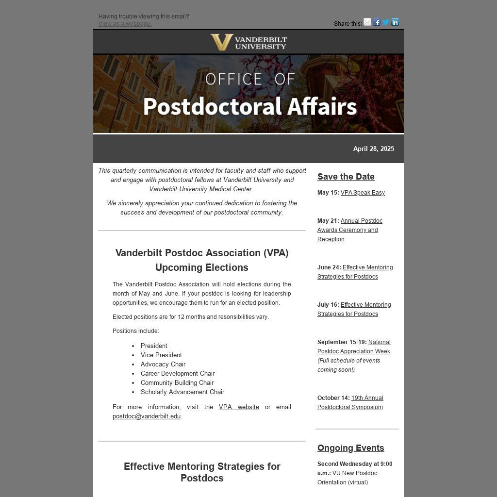 | This quarterly communication is intended for faculty and staff who support and engage with postdoctoral fellows at Vanderbilt University and Vanderbilt University Medical Center.