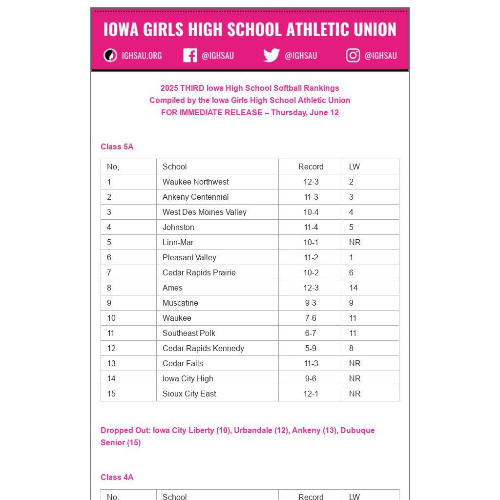 2025 THIRD Iowa High School Softball Rankings