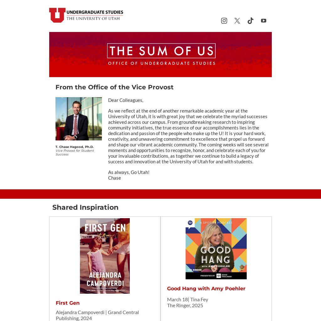 As we reflect at the end of another remarkable academic year at the University of Utah, it is with great joy that we celebrate the myriad successes achieved across our campus. From groundbreaking research to inspiring community initiatives, the true essence of our accomplishments lies in the dedication and passion of the people who make up the U! It is your hard work, creativity, and unwavering commitment to excellence that propel us forward and shape our vibrant academic community. The coming weeks will see several moments and opportunities to recognize, honor, and celebrate each of you for your invaluable contributions, as together we continue to build a legacy of success and innovation at the University of Utah for and with students.