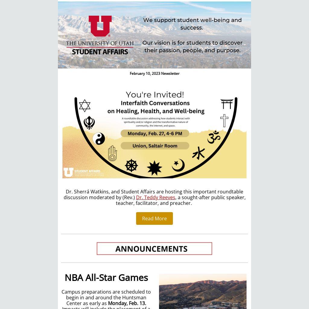 All Student Affair staff members are invited to get together for the Salt Lake Gallery Stroll on Feb. 17 and March 17.