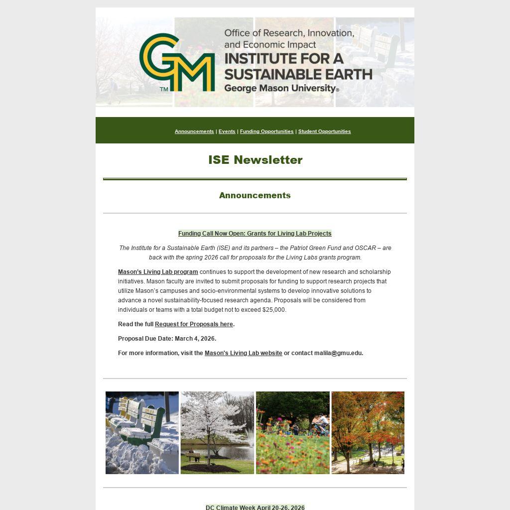 The Institute for a Sustainable Earth (ISE) aims to connect members of the Mason community with others across the Mason community–and with other communities, policy-makers, businesses and organizations–so that, together, we can more effectively address the world’s pressing sustainability and resilience challenges. The ISE Newsletter provides up-to-date information on conferences, funding opportunities, and research pertaining to environmental science and sustainability. The biweekly newsletter aims to facilitate information sharing among researchers, practitioners, and relevant local, national, and international organization.