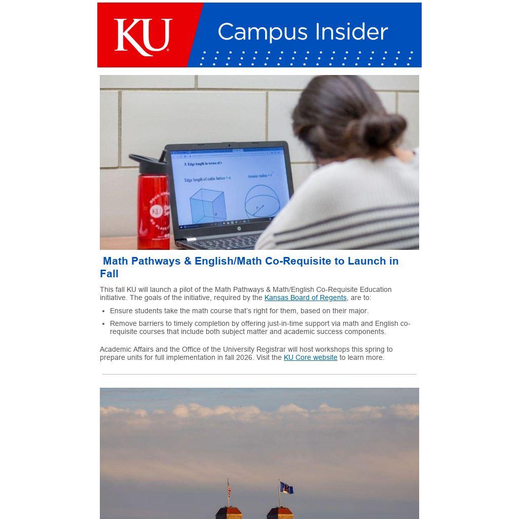 This fall KU will launch a pilot of the Math Pathways & Math/English Co-Requisite Education initiative. The goals of the initiative, required by the Kansas Board of Regents, are to: