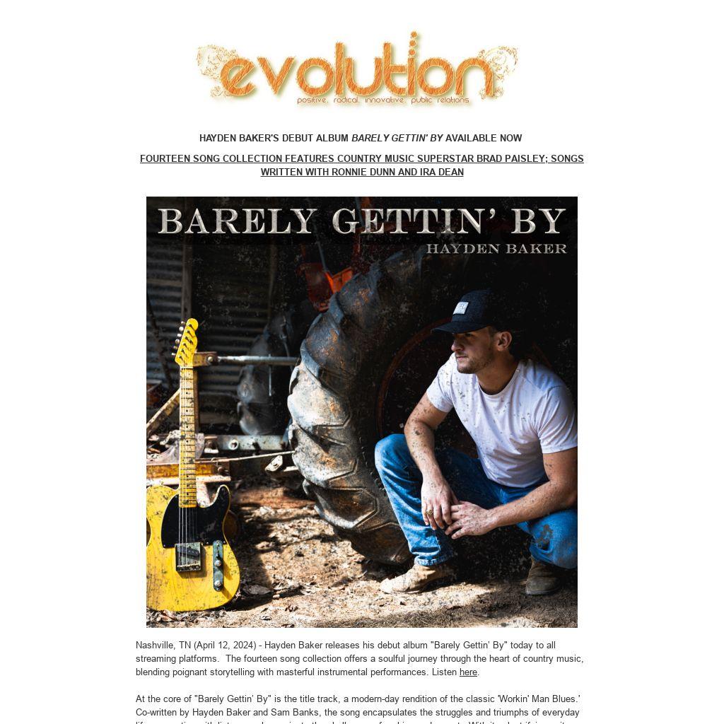 Nashville, TN (April 12, 2024) - Hayden Baker releases his debut album "Barely Gettin’ By" today to all streaming platforms. The fourteen song collection offers a soulful journey through the heart of country music, blending poignant storytelling with masterful instrumental performances. Listen