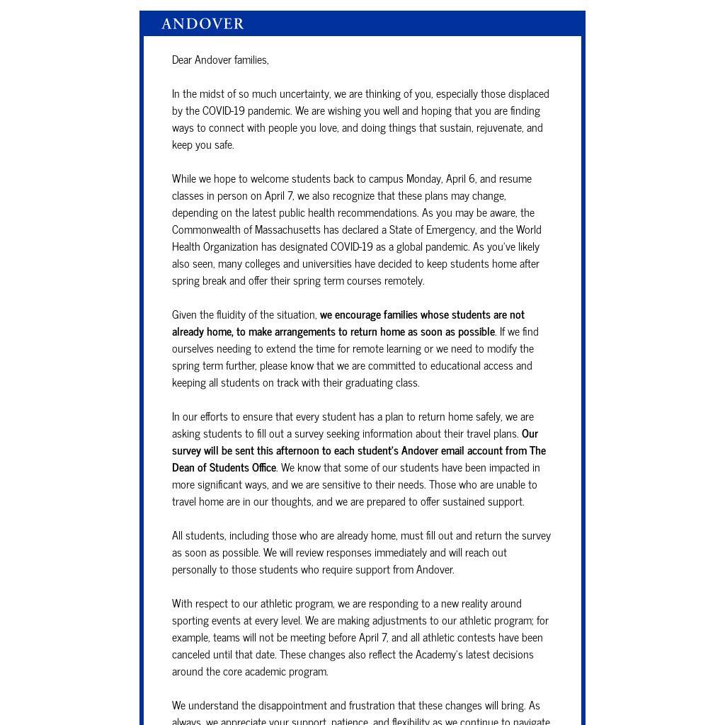 With respect to our athletic program, we are responding to a new reality around sporting events at every level. We are making adjustments to our athletic program; for example, teams will not be meeting before April 7, and all athletic contests have been canceled until that date. These changes also reflect the Academy’s latest decisions around the core academic program.