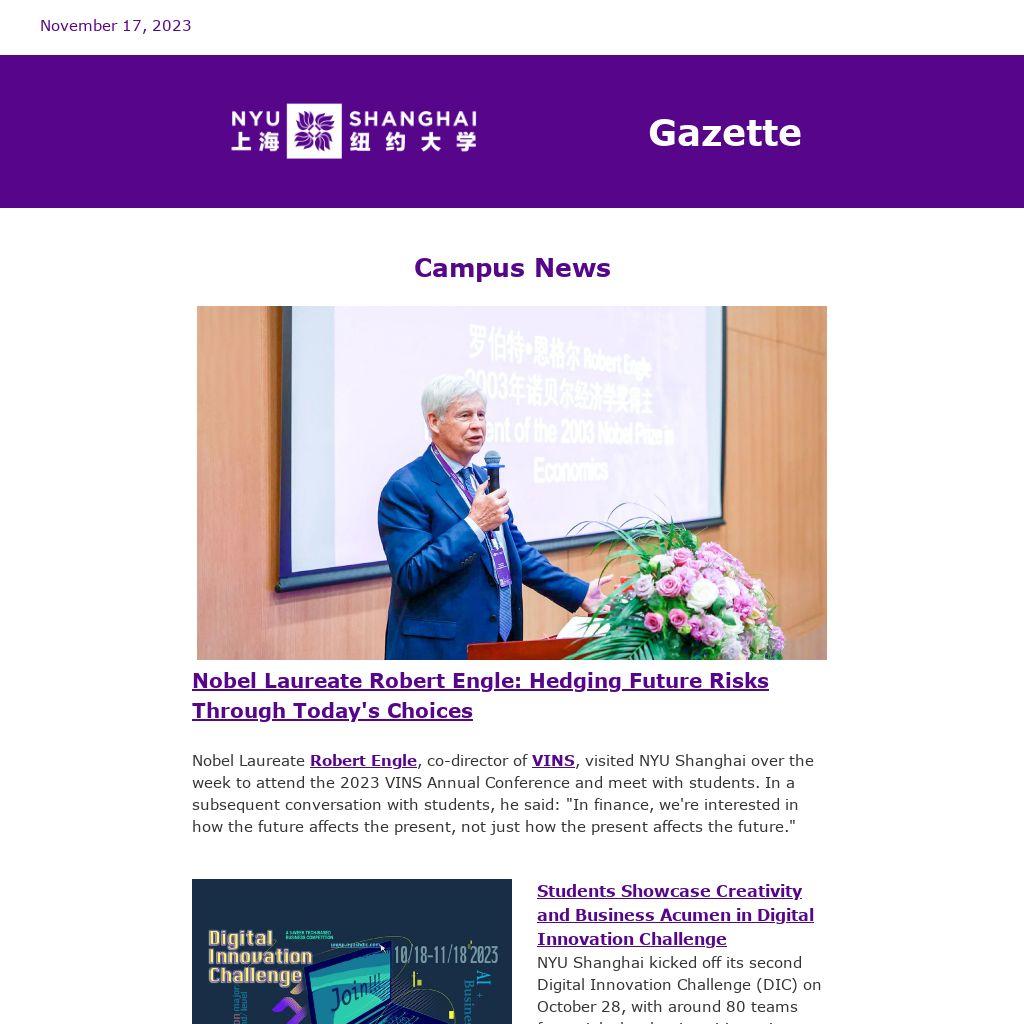 Nobel Laureate Robert Engle, co-director of VINS, visited NYU Shanghai over the week to attend the 2023 VINS Annual Conference and meet with students. In a subsequent conversation with students, he said: "In finance, we're interested in how the future affects the present, not just how the present affects the future."