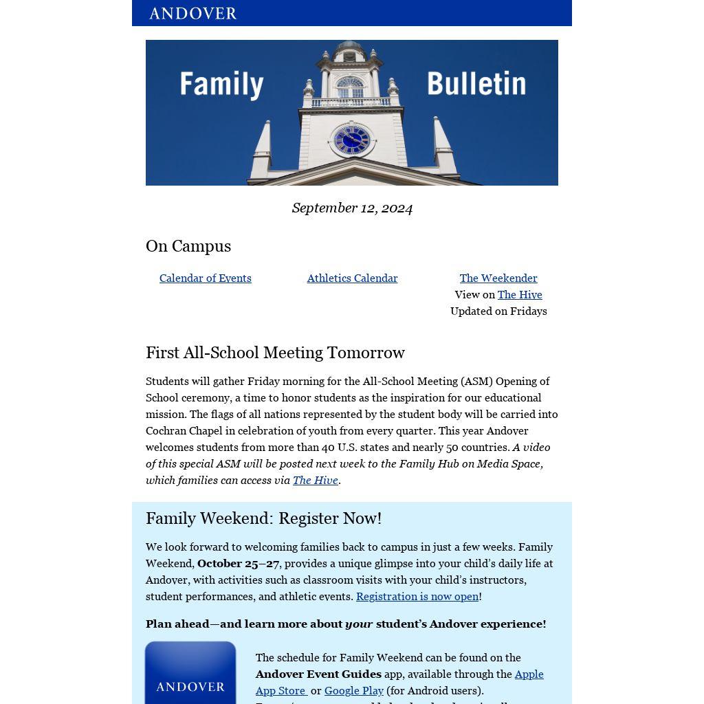 We look forward to welcoming families back to campus in just a few weeks. Family Weekend, October 25–27, provides a unique glimpse into your child’s daily life at Andover, with activities such as classroom visits with your child’s instructors, student performances, and athletic events. Registration is now open!
