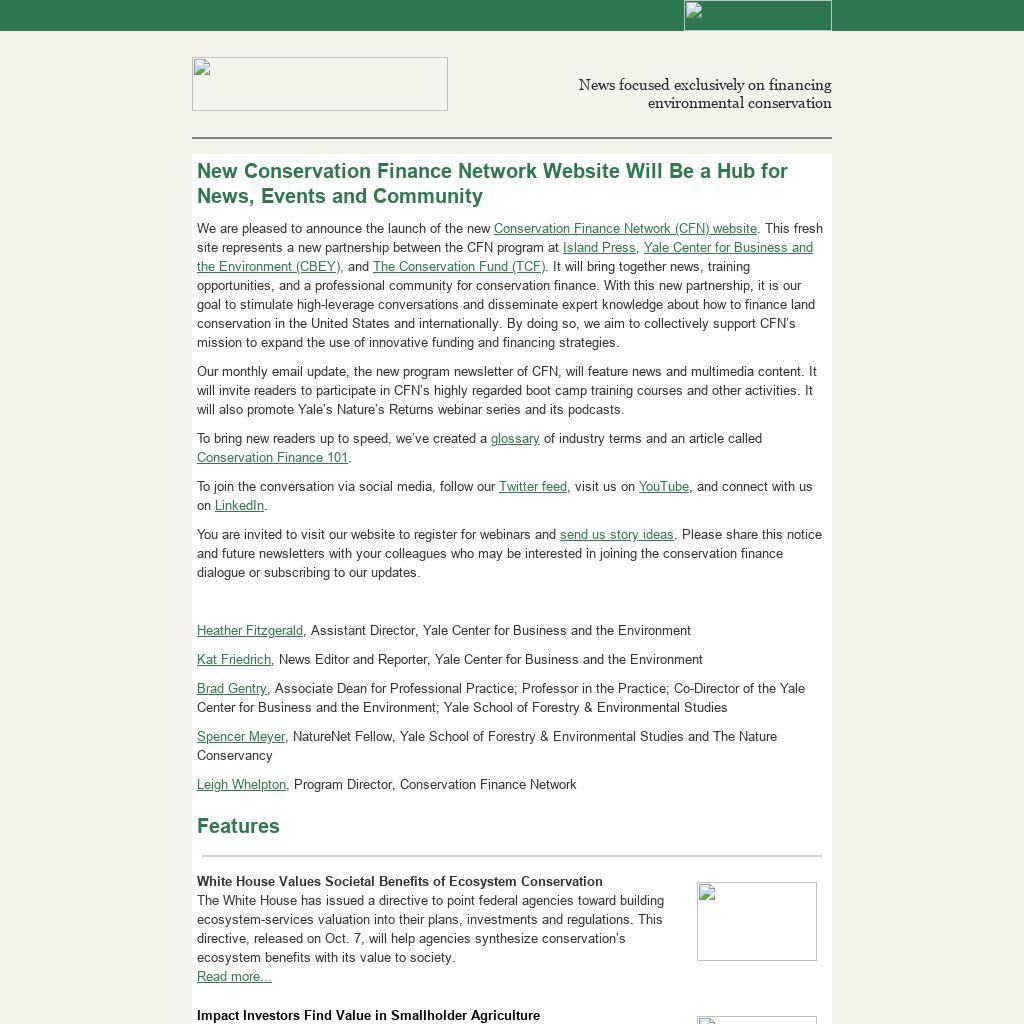 Our monthly email update, the new program newsletter of CFN, will feature news and multimedia content. It will invite readers to participate in CFN’s highly regarded boot camp training courses and other activities. It will also promote Yale’s Nature’s Returns webinar series and its podcasts. You are invited to visit our website to register for webinars and send us story ideas. Please share this notice and future newsletters with your colleagues who may be interested in joining the conservation finance dialogue or subscribing to our updates.