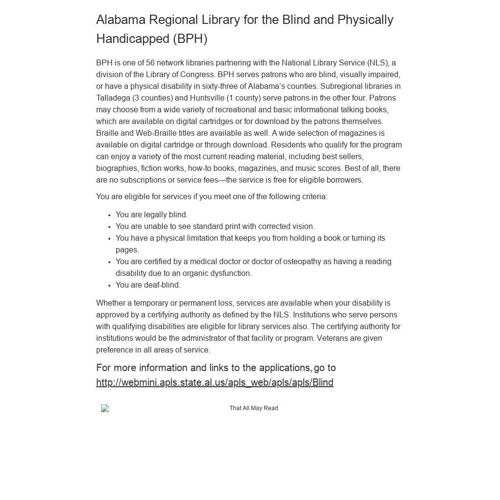 Alabama Regional Library for the Blind and Physically Handicapped (BPH)