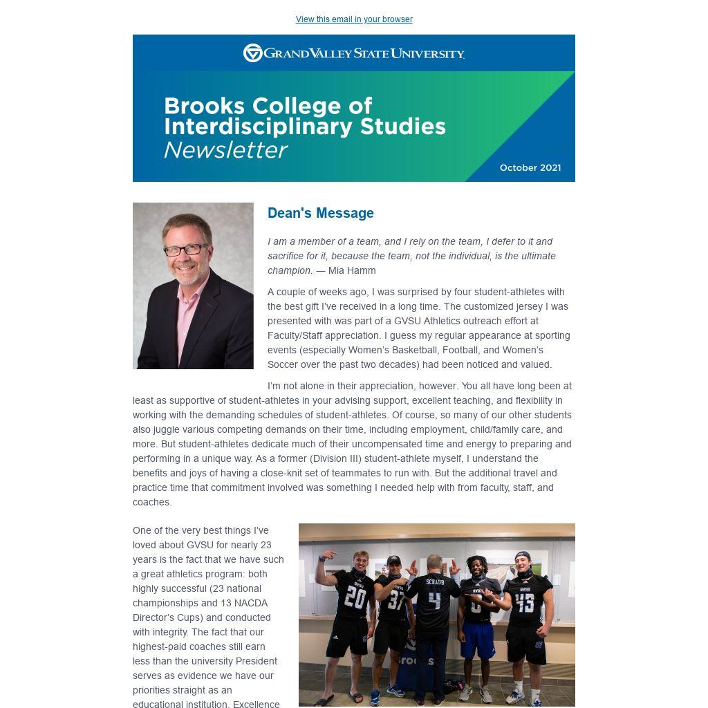 And then there’s this: the retention of student-athletes at GVSU exceeds that of the general population of undergraduates (93% for the women and 88% for the men). The 570 rostered student-athletes also boasted a 2020-21 cumulative GPA of 3.16; that’s remarkable, considering the practice, travel, and competition requirements. Our colleagues in athletics are dedicated educators, who work alongside us for student success. I’m proud of Brooks College’s history of holding up our part of this team effort. Thanks, and Go Lakers!
