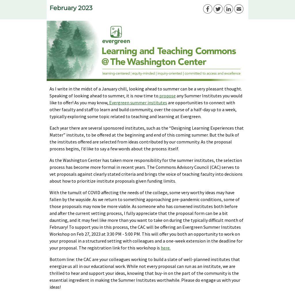 As I write in the midst of a January chill, looking ahead to summer can be a very pleasant thought. Speaking of looking ahead to summer, it is now time to propose any Summer Institutes you would like to offer! As you may know, Evergreen summer institutes are opportunities to connect with other faculty and staff to learn and build community, over the course of a half-day up to a week, typically exploring some topic related to teaching and learning at Evergreen.