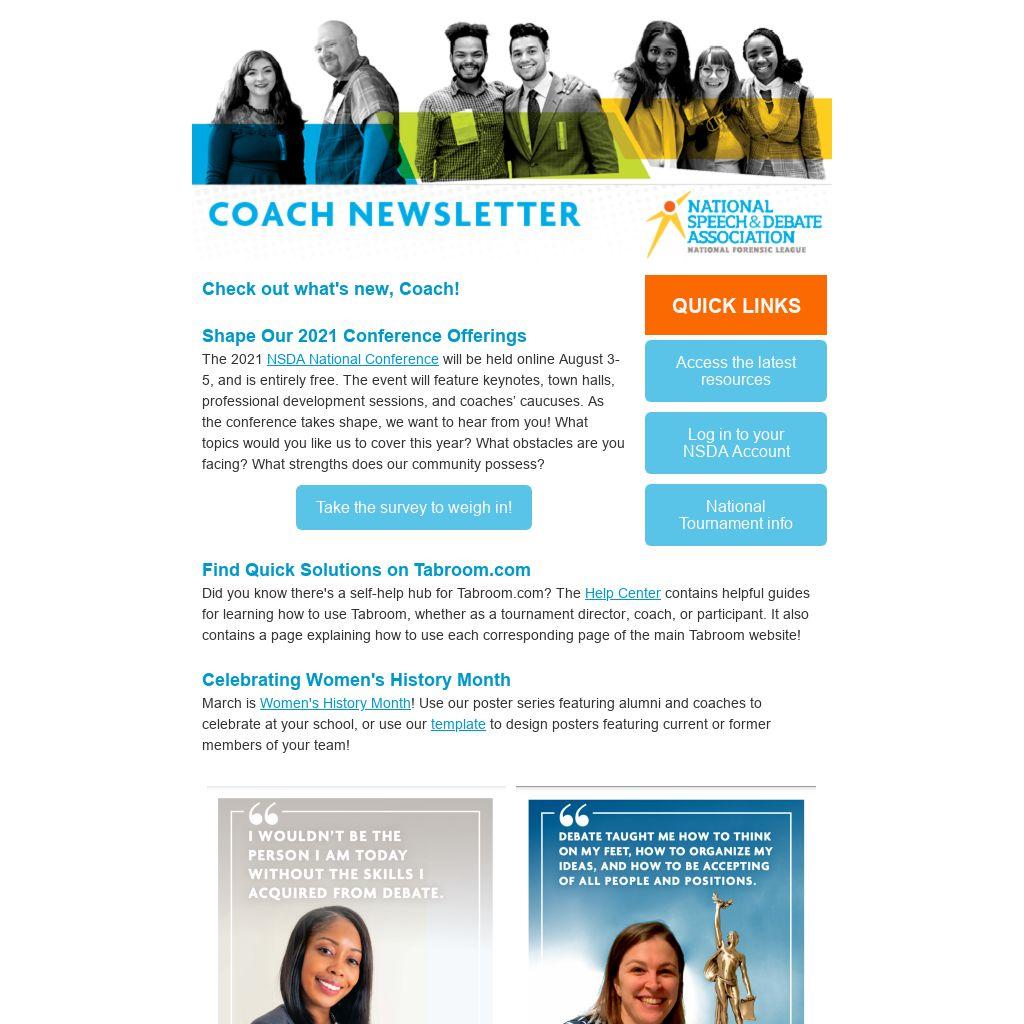 Shape Our 2021 Conference OfferingsThe 2021 NSDA National Conference will be held online August 3-5, and is entirely free. The event will feature keynotes, town halls, professional development sessions, and coaches’ caucuses. As the conference takes shape, we want to hear from you! What topics would you like us to cover this year? What obstacles are you facing? What strengths does our community possess?