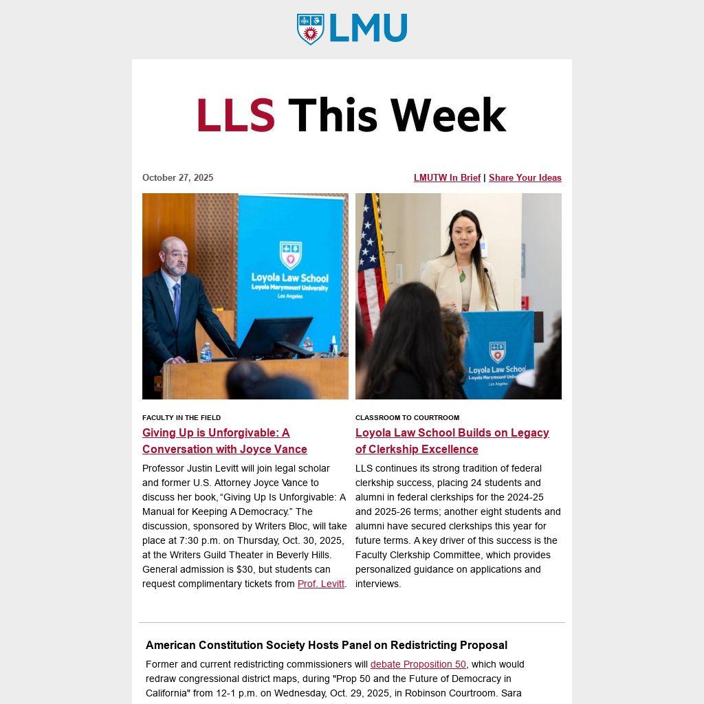 LLS This Week, LMU Loyola Law School’s campus newsletter, keeps our community informed about official events, programs, and important campus information. It appears every Monday during the academic semester.