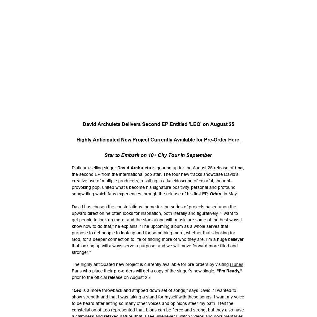 Platinum-selling singer David Archuleta is gearing up for the August 25 release of Leo, the second EP from the international pop star. The four new tracks showcase David’s creative use of multiple producers, resulting in a kaleidoscope of colorful, thought-provoking pop, united what's become his signature positivity, personal and profound songwriting which fans experiences through the release of his first EP, Orion, in May.