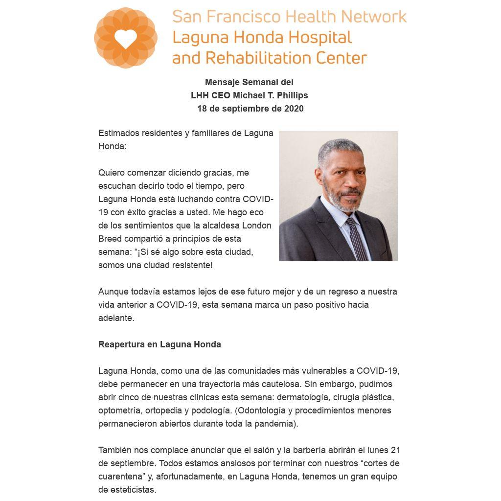 Quiero comenzar diciendo gracias, me escuchan decirlo todo el tiempo, pero Laguna Honda está luchando contra COVID-19 con éxito gracias a usted. Me hago eco de los sentimientos que la alcaldesa London Breed compartió a principios de esta semana: “¡Si sé algo sobre esta ciudad, somos una ciudad resistente!