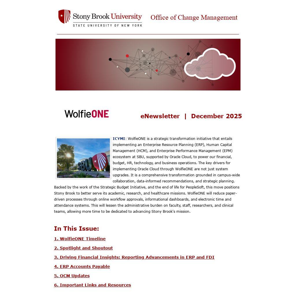 ICYMI: WolfieONE is a strategic transformation initiative that entails implementing an Enterprise Resource Planning (ERP), Human Capital Management (HCM), and Enterprise Performance Management (EPM) ecosystem at SBU, supported by Oracle Cloud, to power our financial, budget, HR, technology, and business operations. The key drivers for implementing Oracle Cloud through WolfieONE are not just system upgrades. It is a comprehensive transformation grounded in campus-wide collaboration, data-informed recommendations, and strategic planning. Backed by the work of the Strategic Budget Initiative, and the end of life for PeopleSoft, this move positions Stony Brook to better serve its academic, research, and healthcare missions. WolfieONE will reduce paper-driven processes through online workflow approvals, informational dashboards, and electronic time and attendance systems. This will lessen the administrative burden on faculty, staff, researchers, and clinical teams, allowing more time to be dedicated to advancing Stony Brook's mission.