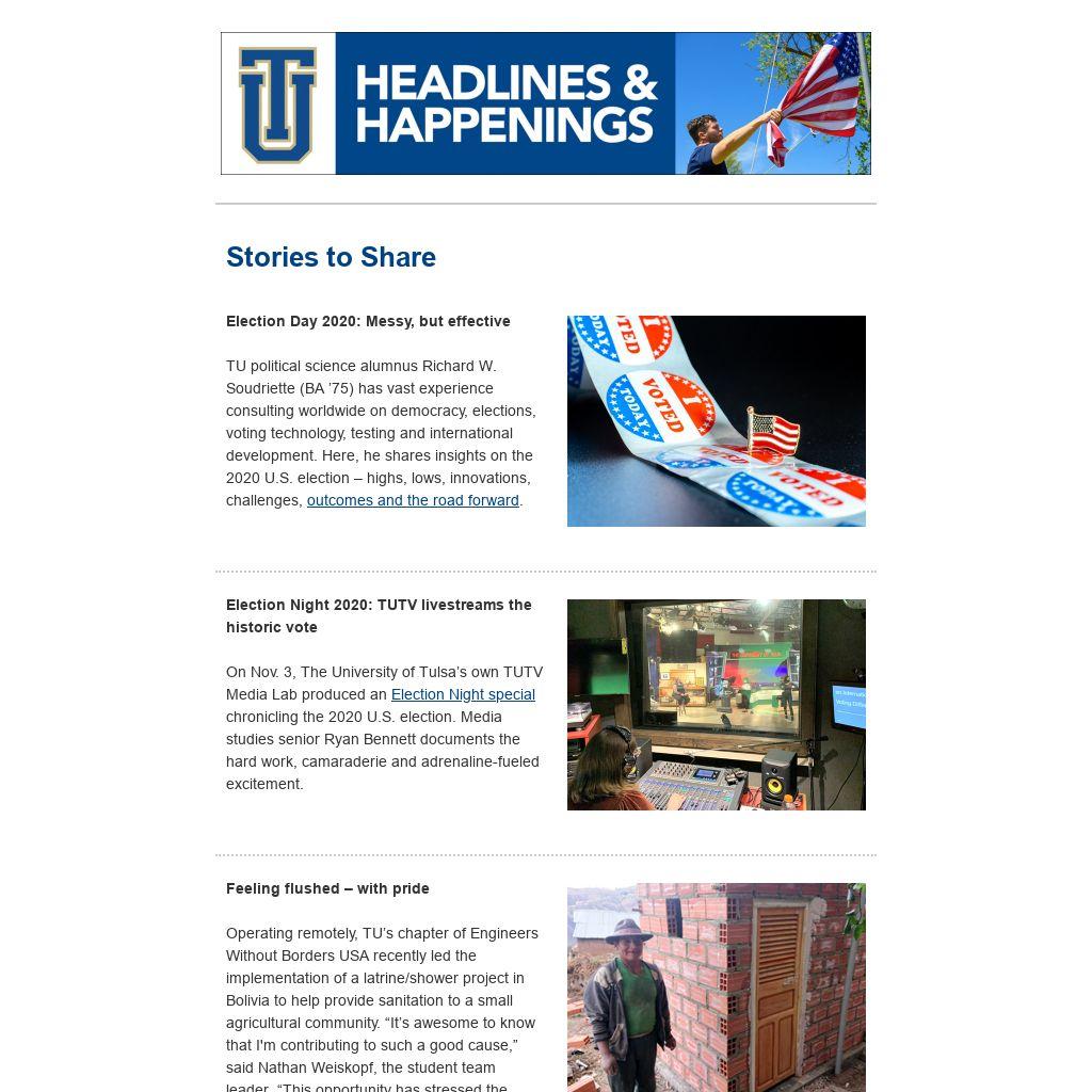 Operating remotely, TU’s chapter of Engineers Without Borders USA recently led the implementation of a latrine/shower project in Bolivia to help provide sanitation to a small agricultural community. “It’s awesome to know that I'm contributing to such a good cause,” said Nathan Weiskopf, the student team leader. “This opportunity has stressed the importance of doing good for others without expecting anything in return.”