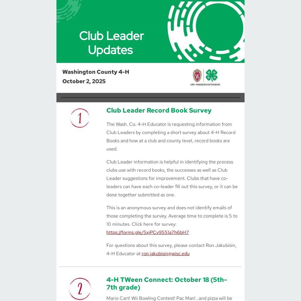 Questions? Please contact 4-H educator Ron Jakubisin at ron.jakubisin@wisc.edu