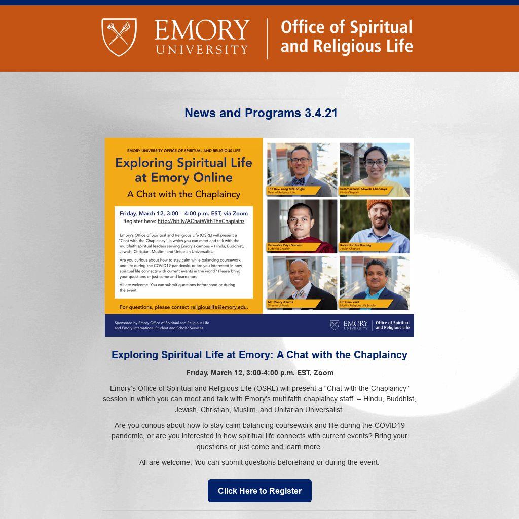 Emory OSRL Enews is published weekly during term by the Emory University Office of Spiritual and Religious Life covering Atlanta-campus programs. For Oxford College spiritual life, please click here. To submit information or to update your preferences, please contact religiouslife@emory.edu.