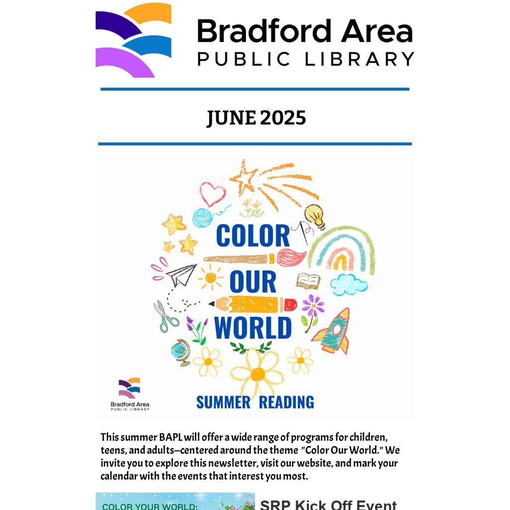 This summer BAPL will offer a wide range of programs for children, teens, and adults—centered around the theme "Color Our World." We invite you to explore this newsletter, visit our website, and mark your calendar with the events that interest you most.