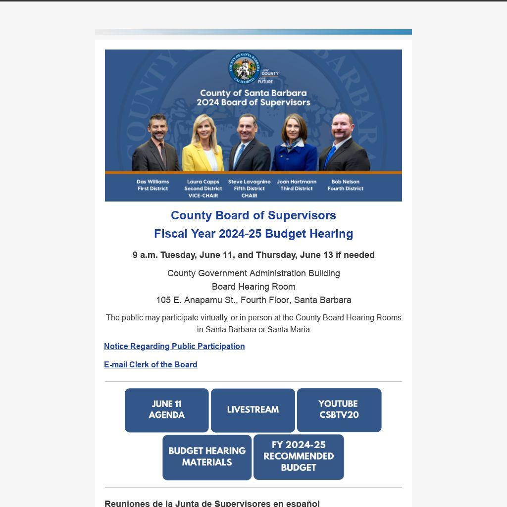 The Santa Barbara County Board of Supervisors will hold budget hearings on June 11, 2024, beginning at 9 a.m. and, if needed, June 13, 2024, in the County Administration Building, Fourth Floor Hearing Room, 105 East Anapamu Street, Santa Barbara. The purpose of the budget hearings is to provide the Board with an overview of the Recommended Budget, provide updates to department budgets since the April workshops, make any final adjustments, and ultimately adopt the Fiscal Year (FY) 2024-25 budget. The public is encouraged to follow the proceedings and comment on the County’s spending priorities at the hearing.