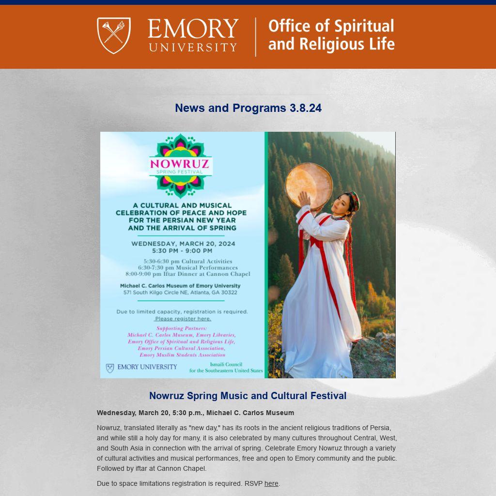 Emory OSRL ENews is published weekly during term by the Emory University Office of Spiritual and Religious Life publicizing Atlanta-campus spiritual life programs. It is not a comprehensive listing. For Oxford College spiritual life, please click here. To submit information or to update your preferences, please contact religiouslife@emory.edu.