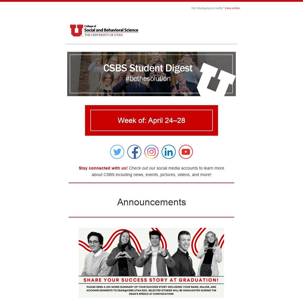 Do you want to be highlighted during the Dean's speech at convocation? Send a 200 word summary of your success story including your name, major, and accomplishments to dean@csbs.utah.edu. Select stories will be shared!