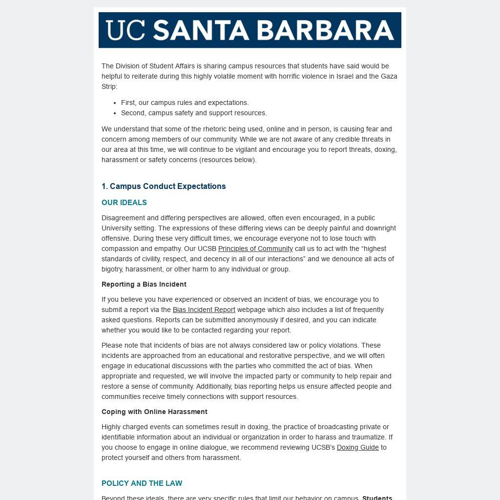 Disagreement and differing perspectives are allowed, often even encouraged, in a public University setting. The expressions of these differing views can be deeply painful and downright offensive. During these very difficult times, we encourage everyone not to lose touch with compassion and empathy. Our UCSB Principles of Community call us to act with the “highest standards of civility, respect, and decency in all of our interactions” and we denounce all acts of bigotry, harassment, or other harm to any individual or group.