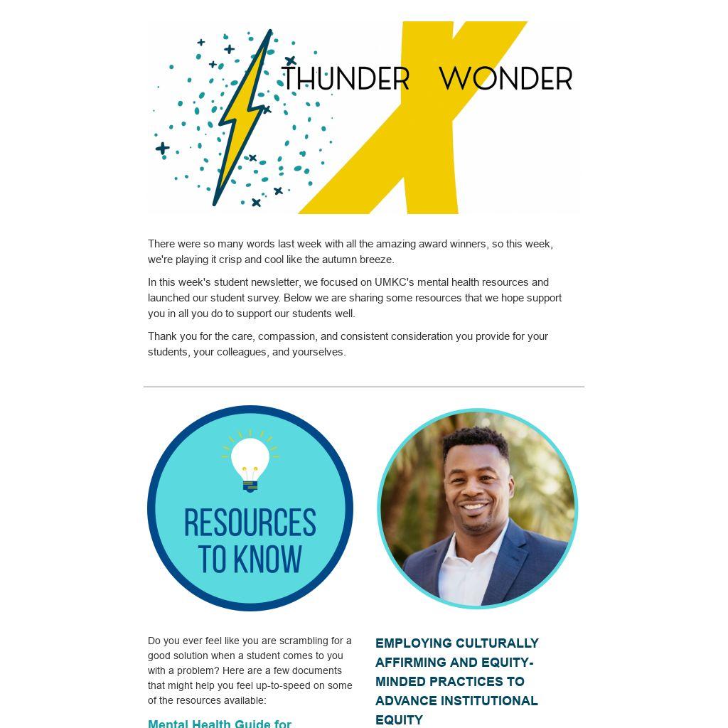 In this week's student newsletter, we focused on UMKC's mental health resources and launched our student survey. Below we are sharing some resources that we hope support you in all you do to support our students well.