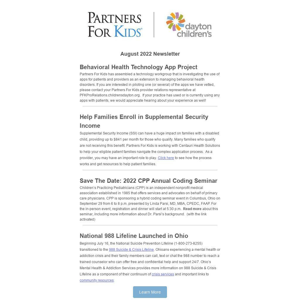 If you have questions regarding any of the information in this newsletter or suggestions regarding newsletter content that would be useful to your practice, please contact us at PFKProRelations@childrensdayton.org.