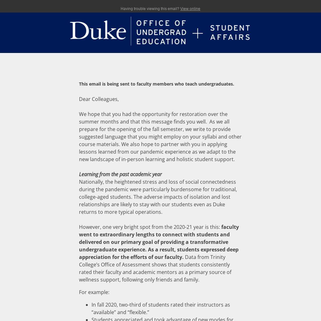 We hope that you had the opportunity for restoration over the summer months and that this message finds you well. As we all prepare for the opening of the fall semester, we write to provide suggested language that you might employ on your syllabi and other course materials. We also hope to partner with you in applying lessons learned from our pandemic experience as we adapt to the new landscape of in-person learning and holistic student support.