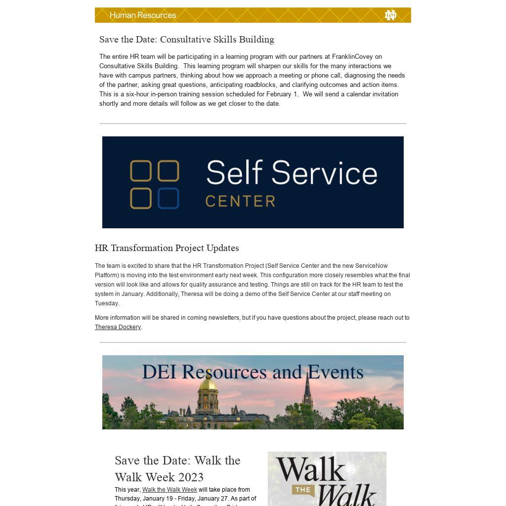The entire HR team will be participating in a learning program with our partners at FranklinCovey on Consultative Skills Building. This learning program will sharpen our skills for the many interactions we have with campus partners, thinking about how we approach a meeting or phone call, diagnosing the needs of the partner, asking great questions, anticipating roadblocks, and clarifying outcomes and action items. This is a six-hour in-person training session scheduled for February 1. We will send a calendar invitation shortly and more details will follow as we get closer to the date.