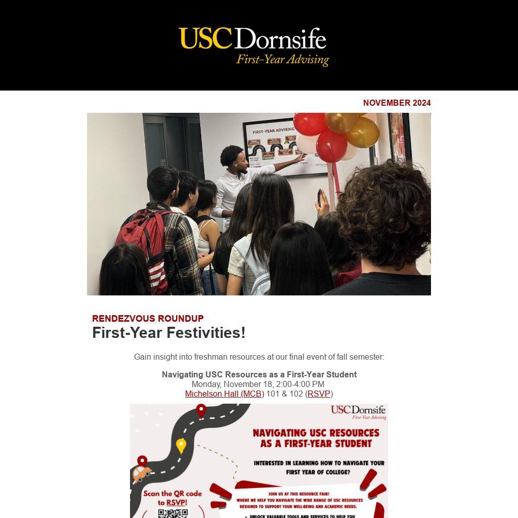 This does not replace the required Pre-Registration Advising appointment with your First-Year Advisor. Have a complex or private question? Schedule an individual 30-minute session with your First-Year Advisor in Advise USC.