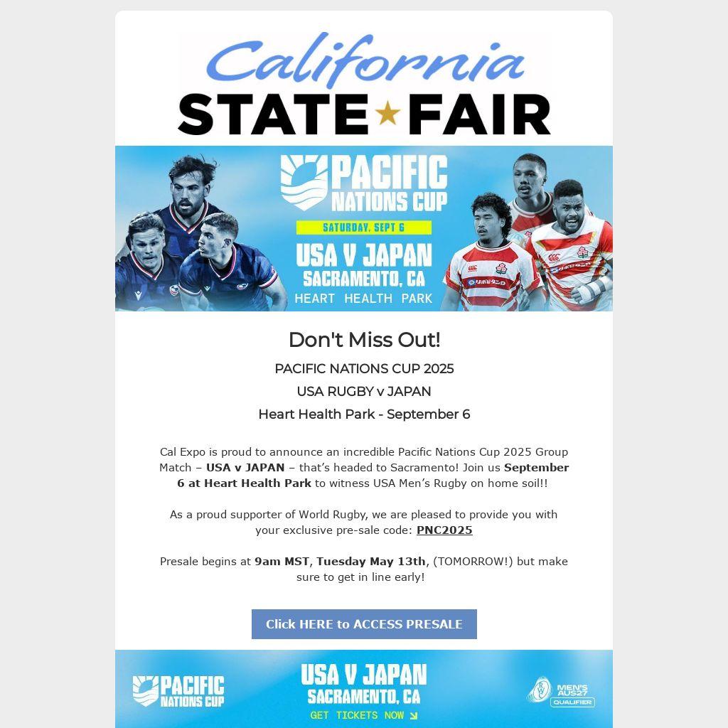 Cal Expo is proud to announce an incredible Pacific Nations Cup 2025 Group Match – USA v JAPAN – that’s headed to Sacramento! Join us September 6 at Heart Health Park to witness USA Men’s Rugby on home soil!!Â