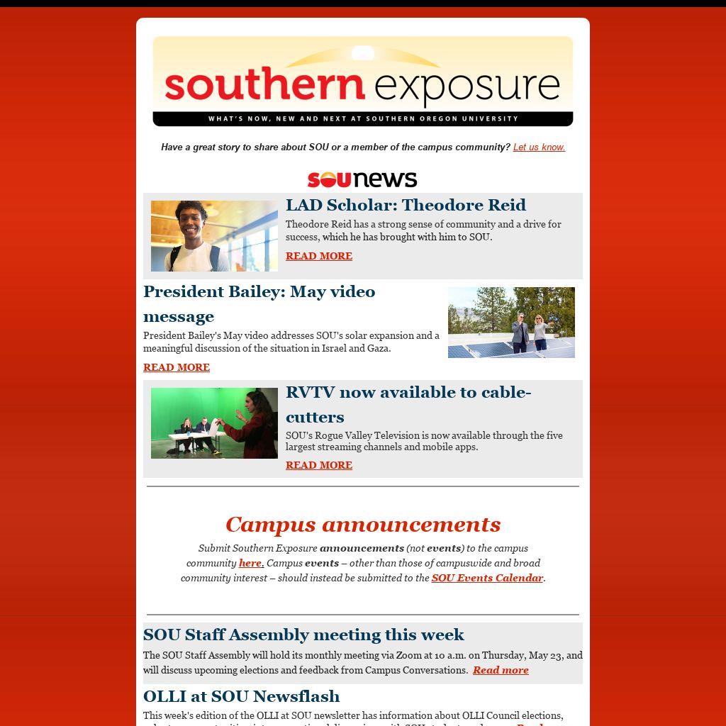 Submit Southern Exposure announcements (not events) to the campus community here. Campus events – other than those of campuswide and broad community interest – should instead be submitted to the SOU Events Calendar.