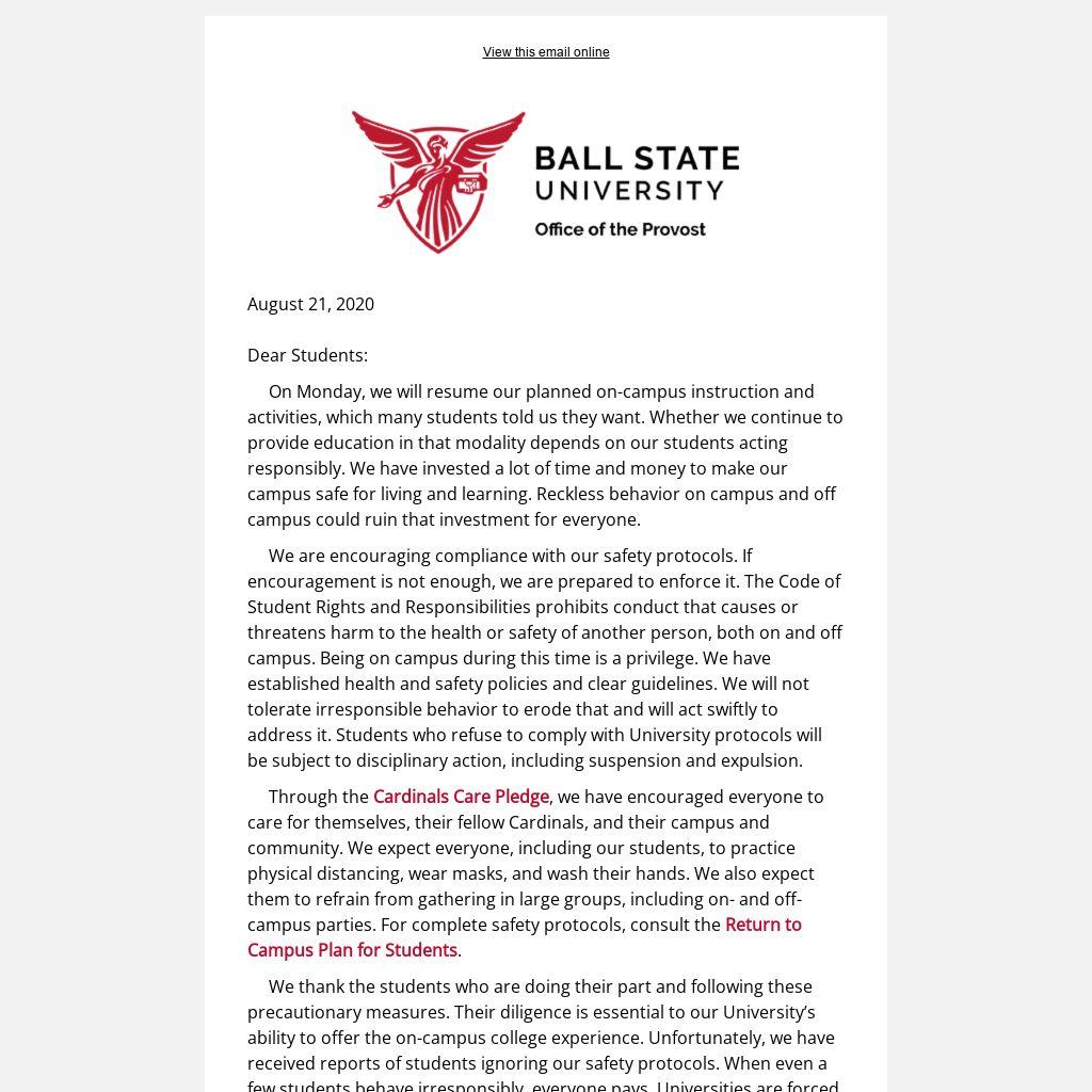 Through the Cardinals Care Pledge, we have encouraged everyone to care for themselves, their fellow Cardinals, and their campus and community. We expect everyone, including our students, to practice physical distancing, wear masks, and wash their hands. We also expect them to refrain from gathering in large groups, including on- and off-campus parties. For complete safety protocols, consult the Return to Campus Plan for Students.