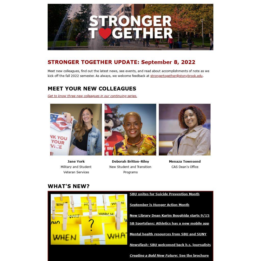 Meet new colleagues, find out the latest news, see events, and read about accomplishments of note as we kick off the fall 2022 semester. As always, we welcome feedback at strongertogether@stonybrook.edu.
