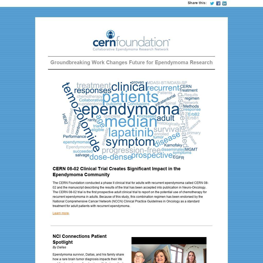 The CERN Foundation conducted a phase II clinical trial for adults with recurrent ependymoma called CERN 08-02 and the manuscript describing the results of the trial has been accepted into publication in Neuro-Oncology. The CERN 08-02 trial is the first prospective adult clinical trial to report on the potential use of chemotherapy for recurrent ependymoma in adults. Because of this study, this combination regimen has been endorsed by the National Comprehensive Cancer Network (NCCN) Clinical Practice Guidelines in Oncology as a standard treatment for adult patients with recurrent ependymoma.