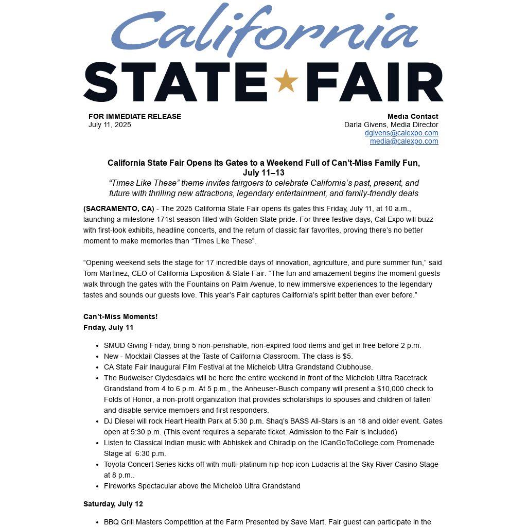 (SACRAMENTO, CA) - The 2025 California State Fair opens its gates this Friday, July 11, at 10 a.m., launching a milestone 171st season filled with Golden State pride. For three festive days, Cal Expo will buzz with first-look exhibits, headline concerts, and the return of classic fair favorites, proving there’s no better moment to make memories than “Times Like These”.